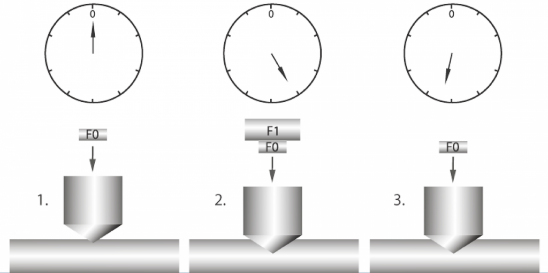Istotą metody Rockwella jest dwustopniowe obciążenie – pomiar polega na wprowadzeniu wstępnej siły (F0), a następnie wykorzystaniu właściwego, większego obciążenia (F).