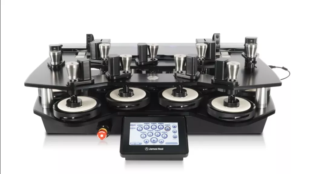 Precyzyjne pierścienie zaciskowe z aluminium lotniczego skracają czas montażu próbek. Uchylna pokrywa kołków napędowych ułatwia szybkie przechodzenie między pillingiem a ścieralnością