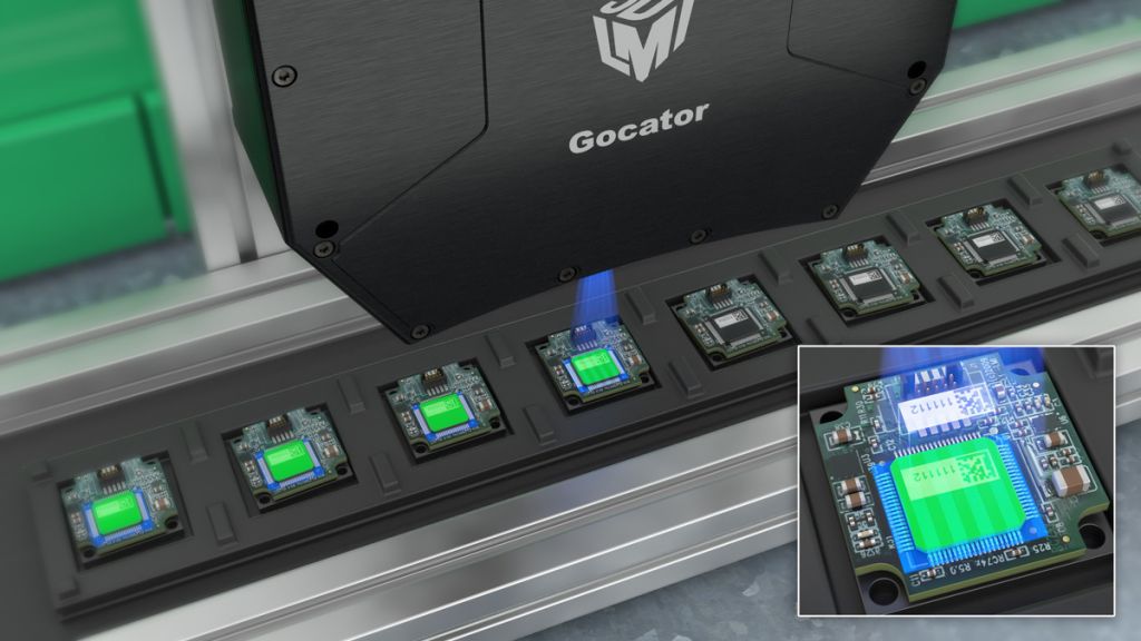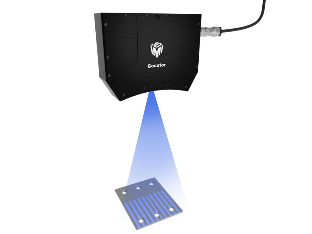 Gocator 3210 zapewnia duże pole widzenia i zakres pomiarowy, co pozwala na przeprowadzenie szybkiej kontroli jakości wielu cech geometrycznych skomplikowanych elementów. Czujnik wykorzystuje technologię światła strukturalnego z niebieskimi diodami LED.