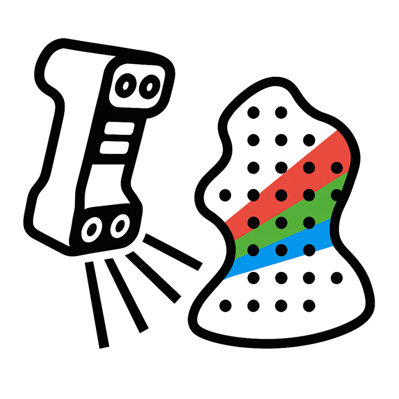 Go!SCAN 3D wykorzystuje technologię światła strukturalnego (LED), która jednocześnie rejestruje geometrię oraz kolor powierzchni obiektu. Pozwala to uzyskać gęste, pełnokolorowe chmury punktów nawet przy złożonych kształtach i zróżnicowanych materiałach.