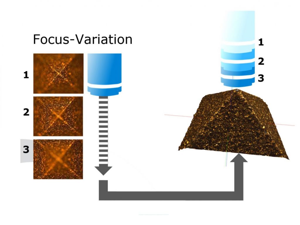 Głównym elementem systemu pomiarowego opartego o mikroskopię różnicowania ogniskowego jest układ optyczny zaczerpnięty z mikroskopu, który można wyposażyć w różne obiektywy, pozwalające na pomiary z różną rozdzielczością. Światło ze źródła przechodzi przez drogę optyczną i pada na powierzchnię mierzonego przedmiotu. Zależnie od jego topografii wiązka odbita rozprasza się na różne kierunki. Wszystkie promienie wracające od powierzchni i docierające do obiektywu są zbierane w układzie optycznym przez detektor. Ze względu na bardzo małą głębokość ogniskowania układu optycznego tylko mały fragment obiektu ma obraz ostry (w ognisku) i tylko ta część obrazu wykorzystywana jest do dalszego przetwarzania. Całość kształtu uzyskuje się przez skanowanie pionowe powierzchni (zmiana odległości pomiędzy obiektywem a detektorem) i sukcesywne uzupełnienie obszarów, w których poprzednio nie uzyskano ogniskowania. Każdy region obiektu ma obraz w ognisku w jednym położeniu pionowym skanera. Zebrane dane z obrazów przetwarzane są na widok trójwymiarowy. Mikroskop różnicowania ogniskowego umożliwia zatem rekonstrukcję topografii powierzchni z obrazów 2D zarejestrowanych pomiędzy najniższym i najwyższym punktem ogniskowania. System pomiarowy jest przy tym mikroskopem optycznym, a więc wszystkie obrazy mierzonego przedmiotu są kolorowe.